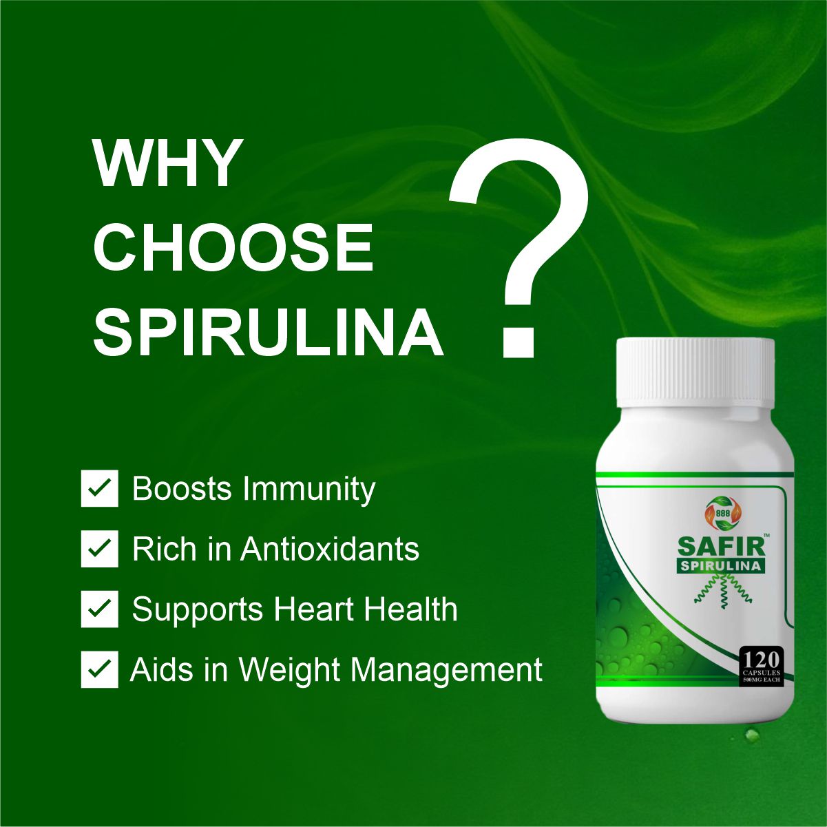 SAFIR Spirulina is a nutrient-dense, plant-based dietary supplement packed with essential vitamins, minerals, and antioxidants to support your overall health and vitality. Each capsule contains 500mg of pure spirulina, a natural superfood known for its immunity-boosting, heart-supporting, and metabolism-enhancing benefits.